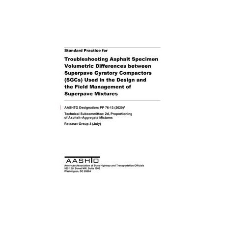 AASHTO PP 76-13 (2020) Standard Practice for Troubleshooting Asphalt Specimen Volumetric Differences between Superpave Gyratory Compactors (SGCs) Used in the Design and the Field Management of Superpave Mixtures