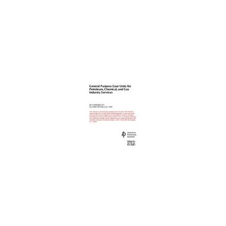Covers the minimum requirements for general-purpose, enclosed single-and multistage gear units incorporating parallel-shaft helical and right angle spiral bevel gears for the petroleum, chemical, and gas industries. Gears manufactured according to this standard are limited to the following pitchline velocities: helical gears shall not exceed 60 meters per second (12,000 feet per minute) and spiral bevel gears shall not exceed 40 meters per second (8,000 feet per minute). This standard includes related lubricating systems, instrumentation, and other auxiliary equipment. Also included in this edition is new material related to gear inspection.