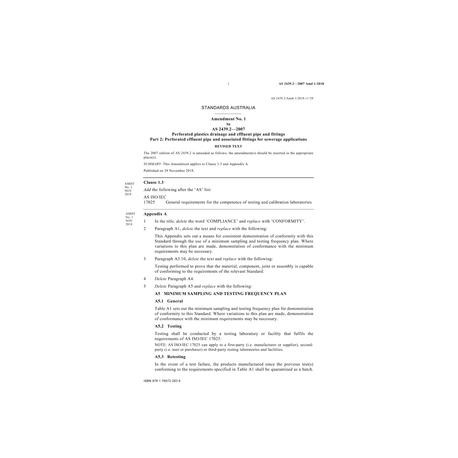 AS 2439.2-2007 Amd 1:2018 Perforated plastics drainage and effluent pipe and fittings, Part 2: Perforated effluent pipe and associated fittings for sewerage applications