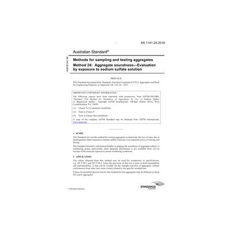 AS 1141.24:2018 [ Current ]Methods for sampling and testing aggregates, Method 24: Aggregate soundness - Evaluation by exposure to sodium sulphate solution