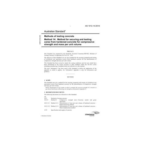 AS 1012.14:2018 Methods of testing concrete, Method 14: Method for securing and testing cores from hardened concrete for compressive strength and mass per unit volume