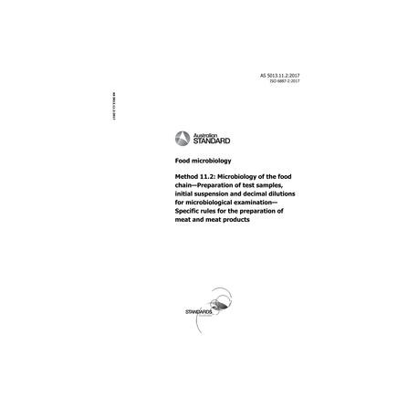 AS 5013.11.2:2017 Food microbiology, Part 11.2: Microbiology of the food chain - Preparation of test samples, initial suspension and decimal dilutions for microbiological examination - Specific rules for the preparation of meat and meat products