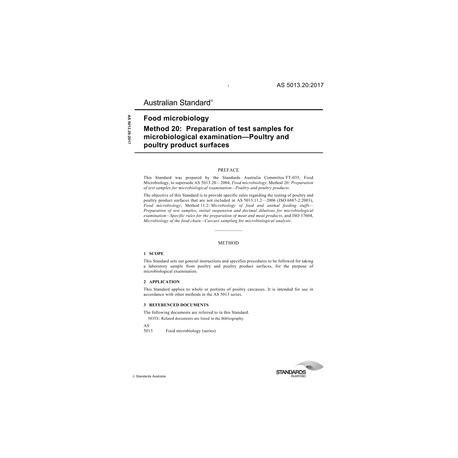AS 5013.20:2017 [ Current ]Food microbiology, Method 20: Preparation of test samples for microbiological examination - Poultry and poultry product surfaces