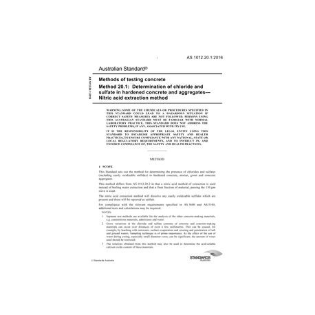 AS 1012.20.1:2016 Methods of testing concrete, Method 20.1: Determination of chloride and sulfate in hardened concrete and aggregates - Nitric acid extraction method