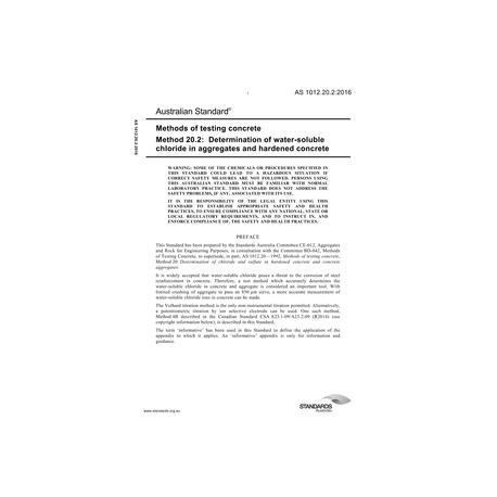 AS 1012.20.2:2016 [ Current ] Methods of testing concrete, Method 20.2: Determination of water-soluble chloride in aggregates and hardened concrete