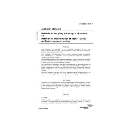 AS 3580.6.1:2016 [ Current ] Methods for sampling and analysis of ambient air, Method 6.1: Determination of ozone - Direct-reading instrumental method