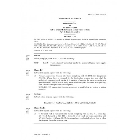 AS 1357.1-2009 Amd 1:2016 [ Current ] Valves primarily for use in heated water systems - Part 1: Protection valves