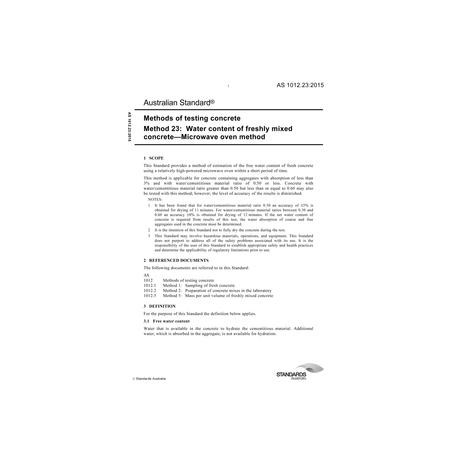 AS 1012.23:2015 [ Current ] Methods of testing concrete, Method 23: Water content of freshly mixed concrete - Microwave oven method