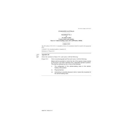 AS 1418.11:2014 Amd 1:2015 [ Current ] Cranes, hoists and winches - Part 11: Vehicle-loading cranes (EN 12999:2011, MOD)