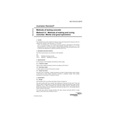 AS 1012.8.3:2015 [ Current ] Methods of testing concrete, Method 8.3: Methods of making and curing concrete - Mortar and grout specimens