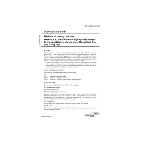AS 1012.3.5:2015 Methods of testing concrete, Method 3.5: Determination of properties related to the consistency of concrete - Slump flow, T500 and J-ring test