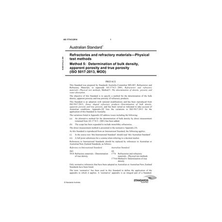 AS 1774.5:2014 Refractories and refractory materials - Physical test methods, Method 5: Determination of bulk density, apparent porosity and true porosity (ISO 5017:2013, MOD)