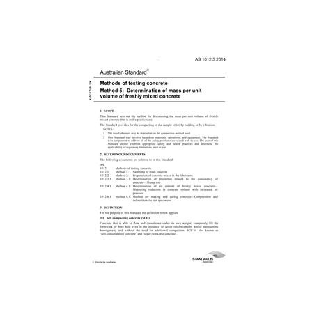AS 1012.5:2014 [ Current ] Methods of testing concrete, Method 5: Determination of mass per unit volume of freshly mixed concrete
