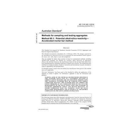 AS 1141.60.1:2014 [ Current ] Methods for sampling and testing aggregates, Method 60.1: Potential alkali-silica reactivity - Accelerated mortar bar method
