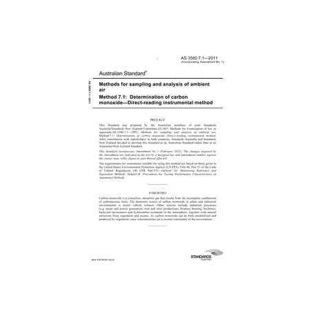 AS 3580.7.1-2011 [ Current ]Methods for sampling and analysis of ambient air, Method 7.1: Determination of carbon monoxide - Direct-reading instrumental method