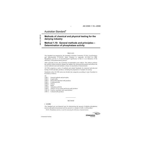 AS 2300.1.10-2008 Methods of chemical and physical testing for the dairying industry, Method 1.10: General methods and principles - Determination of phosphatase activity