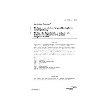 AS 2300.1.9-2008 Methods of chemical and physical testing for the dairying industry, Method 1.9: General methods and principles - Determination of sucrose and glucose - Enzymatic method