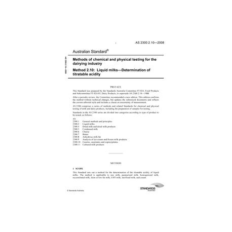 AS 2300.2.10-2008 Methods of chemical and physical testing for the dairying industry, Method 2.10: Liquid milks - Determination of titratable acidity