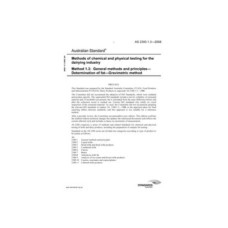 AS 2300.1.3-2008 Methods of chemical and physical testing for the dairying industry, Method 1.3: General methods and principles - Determination of fat - Gravimetric method