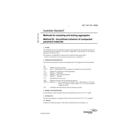 AS 1141.52-2008 [ Pending Revision ] Methods for sampling and testing aggregates, Method 52: Unconfined cohesion of compacted pavement materials