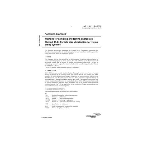 AS 1141.11.2-2008 [ Pending Revision ] Methods for sampling and testing aggregates, Method 11.2: Particle size distribution for vision sizing systems