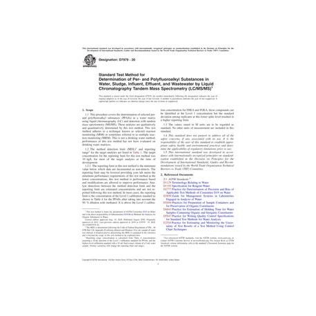 ASTM D7979-20 Standard Test Method for Determination of Per- and Polyfluoroalkyl Substances in Water, Sludge, Influent, Effluent, and Wastewater by Liquid Chromatography Tandem Mass Spectrometry (LC/MS/MS)