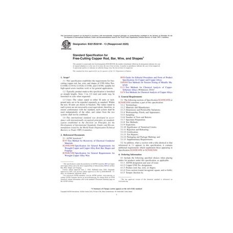 1.1This specification establishes the requirements for free-cutting copper rod, bar, wire, and shapes of UNS Alloy Nos. C14500, C14510, C14520, C14700, and C18700, suitable for high-speed screw machine work or for general applications.