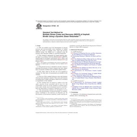 ASTM D7405-20 Standard Test Method for Multiple Stress Creep and Recovery (MSCR) of Asphalt Binder Using a Dynamic Shear Rheometer