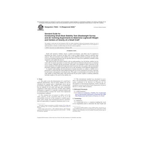 ASTM F3052-14(2020)e1 Standard Guide for Conducting Small Boat Stability Test (Deadweight Survey and Air Inclining Experiment) to Determine Lightcraft Weight and Centers of Gravity of a Small Craft