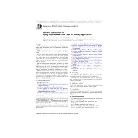 ASTM D7425/D7425M-13(2019) Standard Specification for Spray Polyurethane Foam Used for Roofing Applications