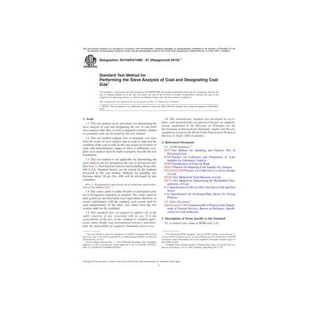 ASTM D4749/D4749M-87(2019)e1 Standard Test Method for Performing the Sieve Analysis of Coal and Designating Coal Size