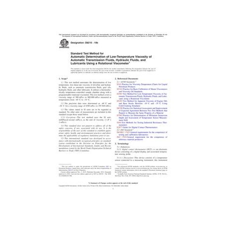 ASTM D8210-19b Standard Test Method for Automatic Determination of Low-Temperature Viscosity of Automatic Transmission Fluids, Hydraulic Fluids, and Lubricants Using a Rotational Viscometer