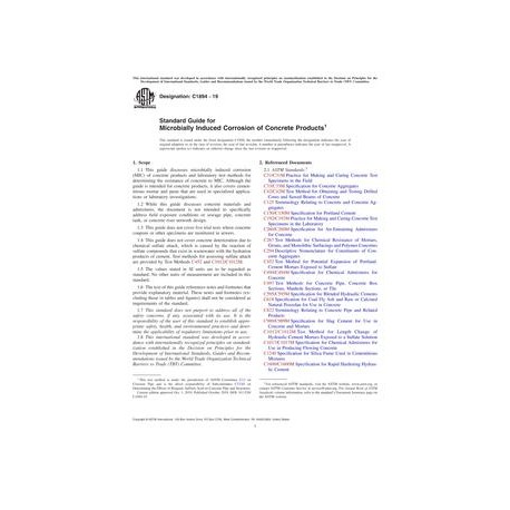 1.1This guide discusses microbially induced corrosion (MIC) of concrete products and laboratory test methods for determining the resistance of concrete to MIC. Although the guide is intended for concrete products, it also covers cementitious mortar and paste that are used in specialized applications or laboratory investigations.