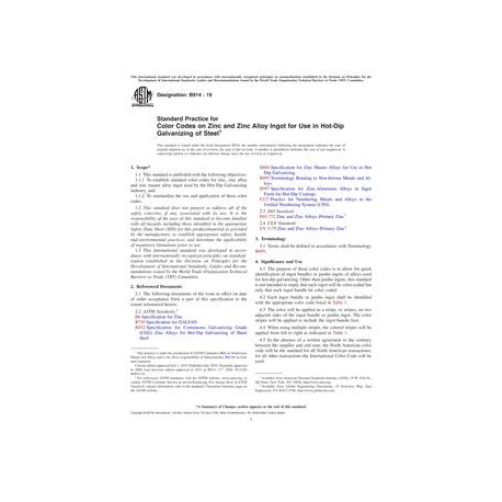 ASTM B914-19 Standard Practice for Color Codes on Zinc and Zinc Alloy Ingot for Use in Hot-Dip Galvanizing of Steel