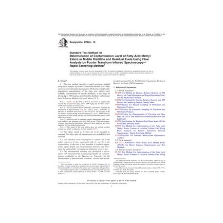 ASTM D7963-19 Standard Test Method for Determination of Contamination Level of Fatty Acid Methyl Esters in Middle Distillate and Residual Fuels Using Flow Analysis by Fourier Transform Infrared Spectroscopy-Rapid Screening Method