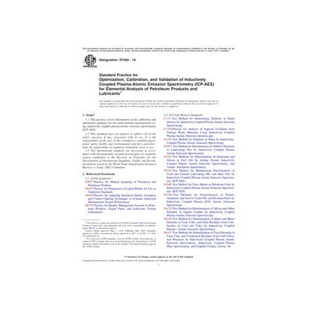 ASTM D7260-19 Standard Practice for Optimization, Calibration, and Validation of Inductively Coupled Plasma-Atomic Emission Spectrometry (ICP-AES) for Elemental Analysis of Petroleum Products and Lubricants