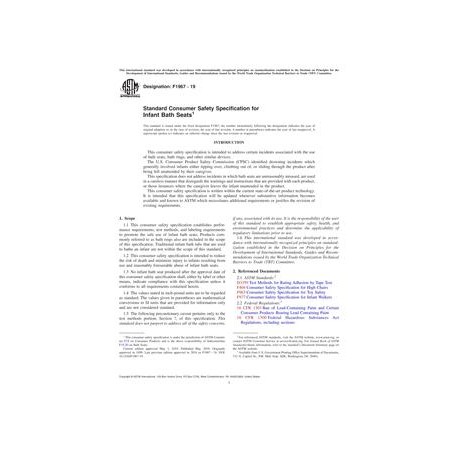 1.1This consumer safety specification establishes performance requirements, test methods, and labeling requirements to promote the safe use of infant bath seats. Products commonly referred to as bath rings also are included in the scope of this specification. Traditional infant bath tubs that are used to bathe an infant are not within the scope of this standard.