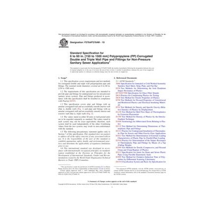 ASTM F2764/F2764M-19 Standard Specification for 6 to 60 in. [150 to 1500 mm] Polypropylene (PP) Corrugated Double and Triple Wall Pipe and Fittings for Non-Pressure Sanitary Sewer Applications