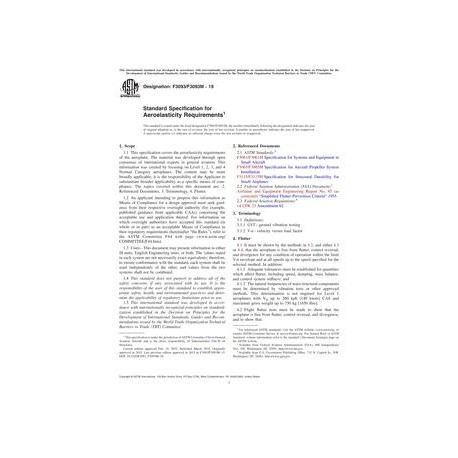 1.1This specification covers the aeroelasticity requirements of the aeroplane. The material was developed through open consensus of international experts in general aviation. This information was created by focusing on Level 1, 2, 3, and 4 Normal Category aeroplanes. The content may be more broadly applicable; it is the responsibility of the Applicant to substantiate broader applicability as a specific means of compliance. The topics covered within this document are: 2. Referenced Documents, 3. Terminology, 4. Flutter.