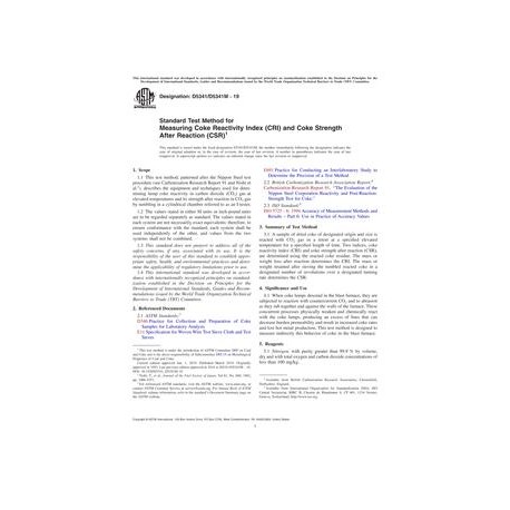 ASTM D5341/D5341M-19 Standard Test Method for Measuring Coke Reactivity Index (CRI) and Coke Strength After Reaction (CSR)