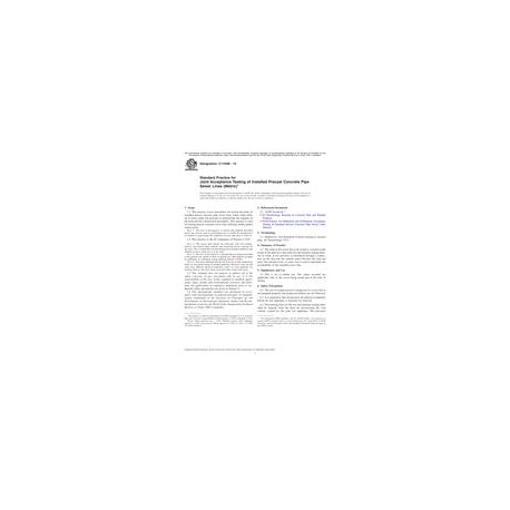 1.1This practice covers procedures for testing the joints of installed precast concrete pipe sewer lines, when using either air or water under low pressure to demonstrate the integrity of the joint and the construction procedures. This practice is used for testing precast concrete sewer lines utilizing rubber gasket sealed joints.