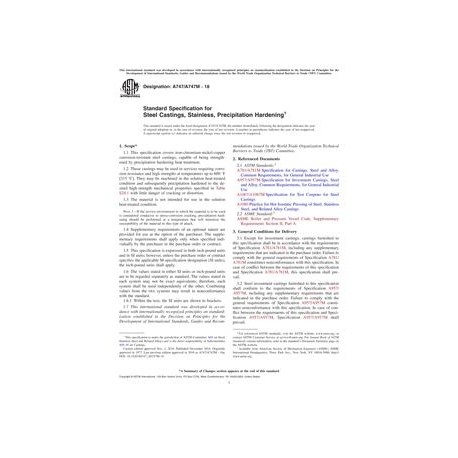 This specification covers iron-chromium-nickel-copper corrosion resistance steel castings capable of being strengthened by precipitation hardening heat treatment. The steel shall be made by electric furnace process with or without separate refining such as argon-oxygen decarburization. The steel materials shall also undergo homogenization heat treatment, solution annealing heat treatment, precipitation hardening and shall conform to the required values of temperature and time and cooling treatment. The materials shall conform to the required chemical compositions of carbon, manganese, phosphorus, sulfur, silicon, chromium, nickel, copper, columbium, and nitrogen.