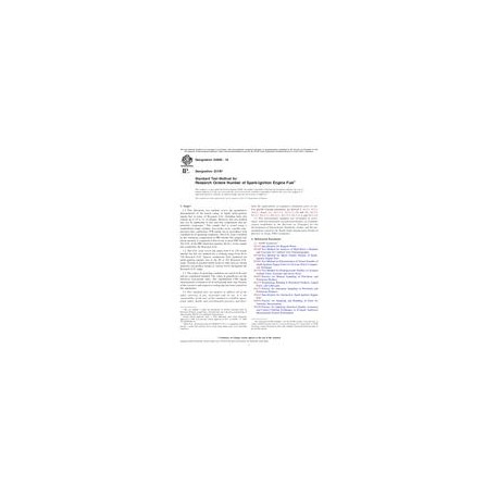 1.1This laboratory test method covers the quantitative determination of the knock rating of liquid spark-ignition engine fuel in terms of Research O.N., including fuels that contain up to 25% v/v of ethanol. However, this test method may not be applicable to fuel and fuel components that are primarily oxygenates.2 The sample fuel is tested using a standardized single cylinder, four-stroke cycle, variable compression ratio, carbureted, CFR engine run in accordance with a defined set of operating conditions. The O.N. scale is defined by the volumetric composition of PRF blends. The sample fuel knock intensity is compared to that of one or more PRF blends. The O.N. of the PRF blend that matches the K.I. of the sample fuel establishes the Research O.N.