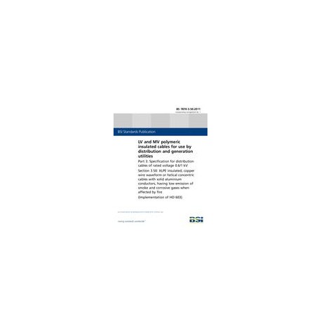 BS 7870-3.50:2011 LV and MV polymeric insulated cables for use by distribution and generation utilities. Specification for distribution cables of rated voltage 0.6/1 kV. XLPE insulated , copper wire waveform or helical concentric cables with solid aluminium conductors, having low emission of smoke and corrosive gases