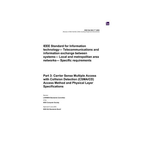 IEEE 802.3-2005 IEEE Standard for Information Technology - Telecommunications and Information Exchange Between Systems - Local and Metropolitan Area Networks - Specific Requirements Part 3: Carrier Sense Multiple Access with Collision Detection (CSMA/CD) Access Method and Physical Layer Specifications