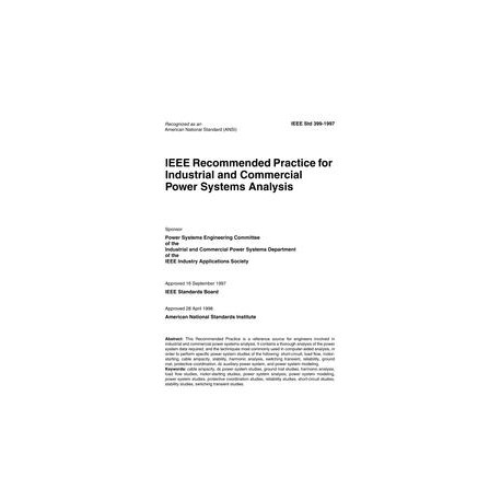 Revision Standard - Active.This IEEE Standards product is part of the Color Books family. Todaya??s intensely competitive business environment forces plant and building management to be very aware of the total owning cost of power distribution systems. Furtheremore, these managers demand assurance of maximum return on capital investments in the power system. Power system studies are used to ensure that this maximum return is achieved, and the IEEE Brown Book is a valuable source of information about the purposes of, and techniques involved in, power system studies. The IEEE Brown Book ties together the essential fundamentals of power system studies; the most common studies for design or operation of a power system; and basic computational methods, including key information on the various types of computer systems and their requirements. By combining field experience in power system engineering with computer systems, engineers can perform detailed studies on both existing and proposed power systems. The planning, design, and operation of industrial and commercial power systems require several studies to assist in the evaluation of initial and future system performance, system reliability, safety, and the ability to grow with production and/or operating requirements. The power system analyses discussed in the IEEE Brown Book can help answer many questions about an existing system, such as the impact of expansion, the stability of the system, and the load distribution of the system. Chapters are devoted to different types of studies, and also include guidance on the preparation for these studies. Some of the studies discussed are: load flow studies, short-circuit studies, stability studies, motor starting studies, harmonic analysis studies, switching transient studies, reliability studies, cable ampacity studies, ground mat studies, coordination studies, and dc auxiliary power system analyses. As a result of focusing on computer studies, the IEEE Brown Book, in conjunction with other IEEE Color
