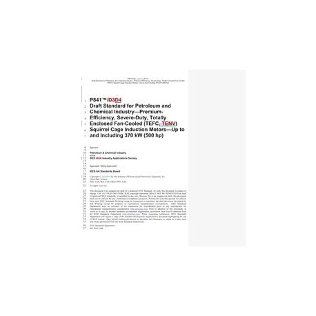 The purpose of this standard is to define a specification that deals with mechanical and electrical performance, electrical insulation systems, corrosion protection, and electrical and mechanical testing for severe-duty totally enclosed squirrel cage polyphase induction motors, 0.75-370 kW (1-500 hp), for petroleum, chemical, and other severe-duty application. Many of the specified materials and components in this standard stem from experience with severely corrosive atmospheres and the necessity for safe, quiet, reliable, premium efficiency motors.