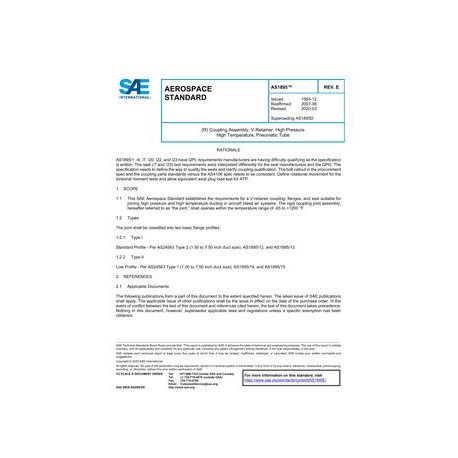 This SAE Aerospace Standard establishes the requirements for a V-retainer coupling, flanges, and seal suitable for joining high pressure and high temperature ducting in aircraft bleed air systems. The rigid coupling joint assembly, hereafter referred to as ¿¿¿the joint,¿¿¿ shall operate within the temperature range of -65 to +1200 ¿¿F.