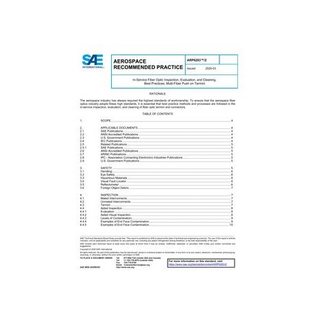 This document provides user information on best practice methods and processes for the in-service inspection, evaluation, and cleaning of multi-fiber push on (MPO) (referred to as multi-fiber) fiber optic interconnect components, test equipment, and test leads based on the information provided in AIR6031 and ARP6283. This document provides the user with a decision-making tool to determine if the fiber optic components are acceptable for operation with multi-fiber fiber optic termini.