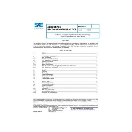 This document provides user information on best practice methods and processes for the in-service inspection, evaluation, and cleaning of expanded beam (EB) fiber optic interconnect components (termini, alignment sleeves, and connectors), test equipment, and test leads based on the information provided in AIR6031 and ARP6283. This document provides the user with a decision-making tool to determine if the fiber optic components are acceptable for operation with EB fiber optic termini.